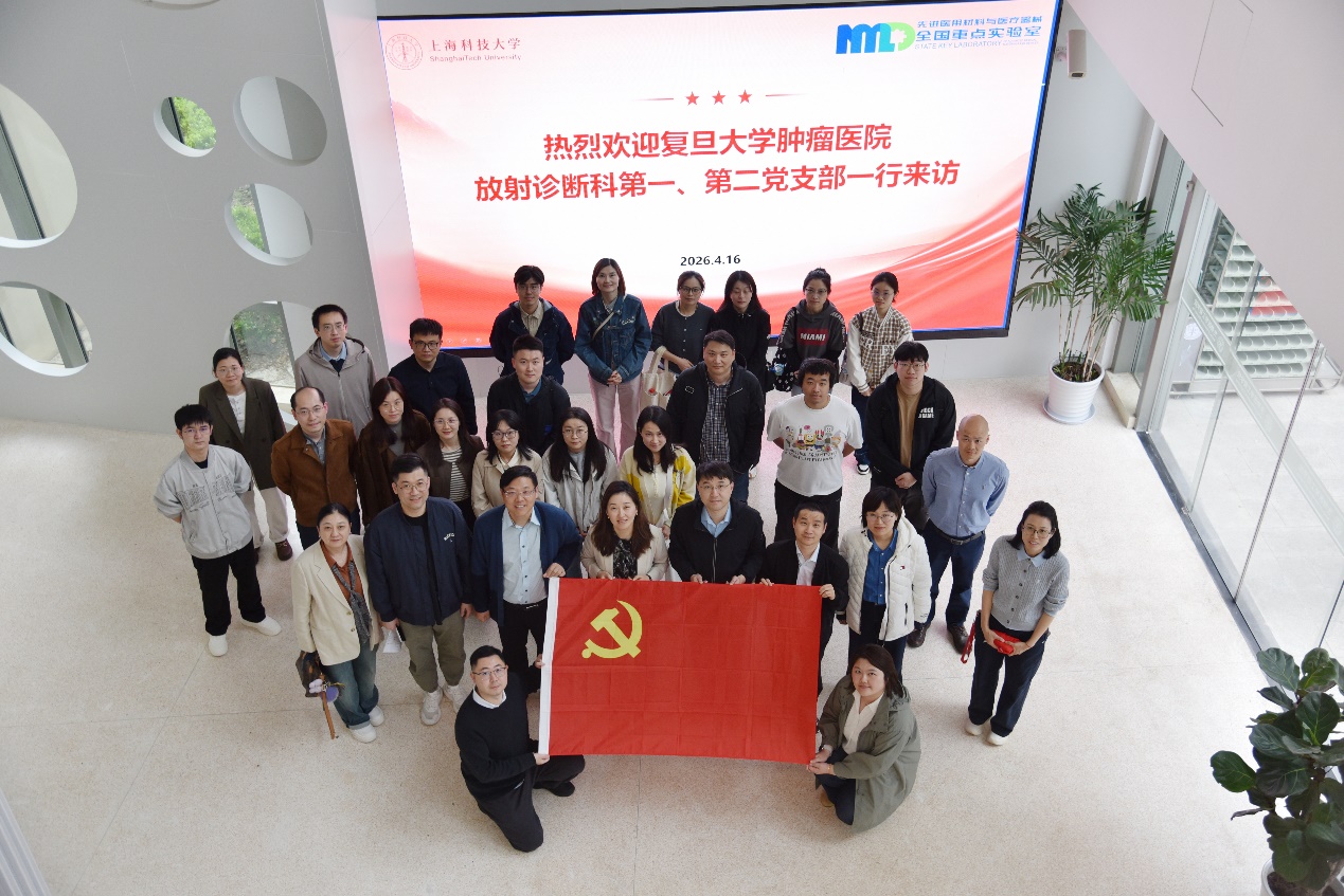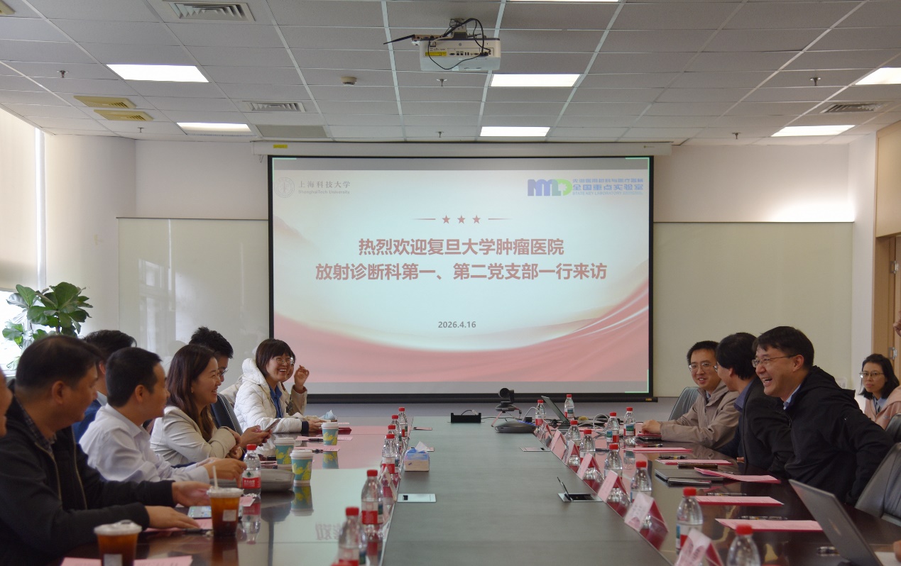 为深入贯彻落实新时代党的建设总要求,推动党建工作与学科建设、科研创新深度融合,搭建医校合作交流新平台,4月16日下午,上海科技大学生物医学工程学院教工党支部与复旦大学附属肿瘤医院放射诊断科第一、第二党支部开展共建交流活动。双方支部党员齐聚一堂,以“党建引领、学科互鉴、协同创新”为核心,通过实地参访、学术分享、研讨交流等形式,共话医工交叉发展新路径,为双方后续深度合作奠定坚实基础。